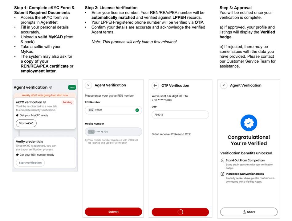 A key part of creating a trusted property marketplace is ensuring that the people property seekers connect with are who they say they are. The ‘Verified’ badge is PropertyGuru’s way of promoting transparency and professionalism on our platform by confirming a real estate professional’s identity and credentials. Our verification process includes steps like validating an agent’s myKAD, confirming their REN/REA/PEA registration and contact number with LPPEH. This helps ensure that agents advertising on our platform are legitimate and qualified, giving property seekers greater confidence when engaging with them. While no system is perfect, the ‘Verified’ badge is designed to minimize the risk of fraud, reduce unprofessional interactions, and make property transactions more secure and trustworthy for everyone on our platform.Why do we verify your identity?